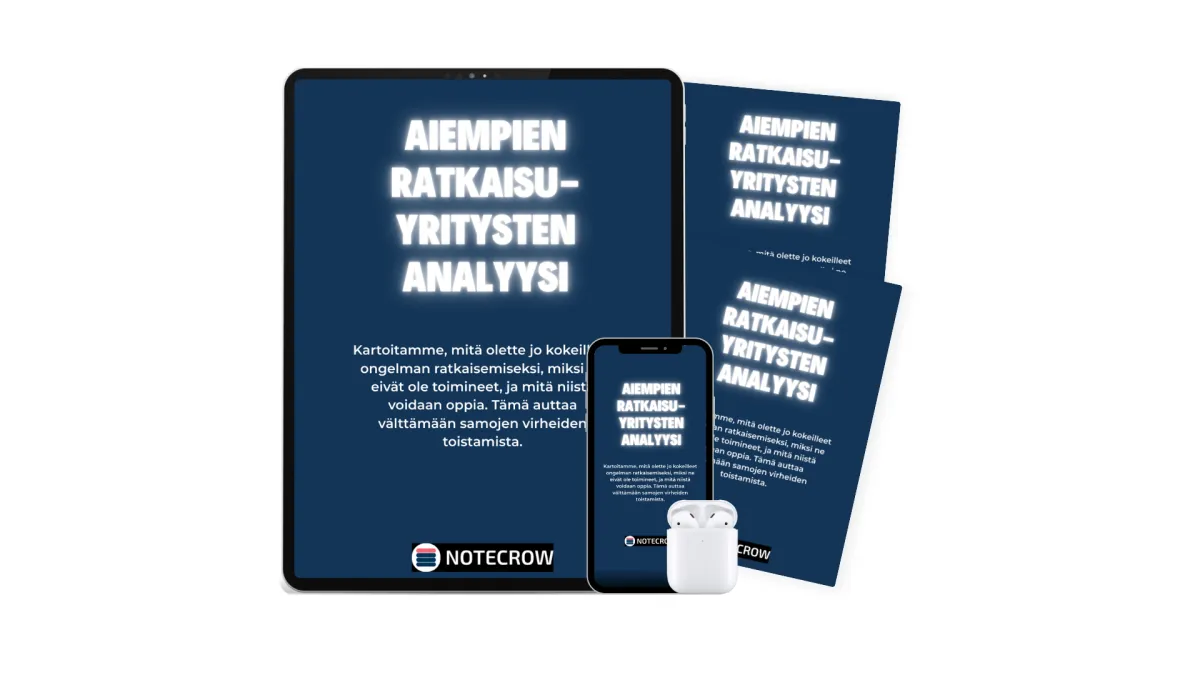 Konsultaatio on aidosti suunniteltu antamaan sinulle konkreettista hyötyä, vaikka et koskaan ostaisi mitään. Siksi annamme takuun: jos et koe saavasi apua, pidämme toisen tapaamisen veloituksetta. Toki toivomme, että näet arvon Notecrow-palvelussamme, mutta uskomme, että paras tapa osoittaa sen arvo on antaa sinulle ensin todellista hyötyä. Noin 70% konsultaatioon osallistuneista päätyy asiakkaiksemme, mutta myös loput 30% saavat mukaansa konkreettisen toimintasuunnitelman, jota voivat hyödyntää riippumatta siitä, miten päättävät edetä. Päätös on aina sinun - me tarjoamme tietoa ja vaihtoehtoja.
