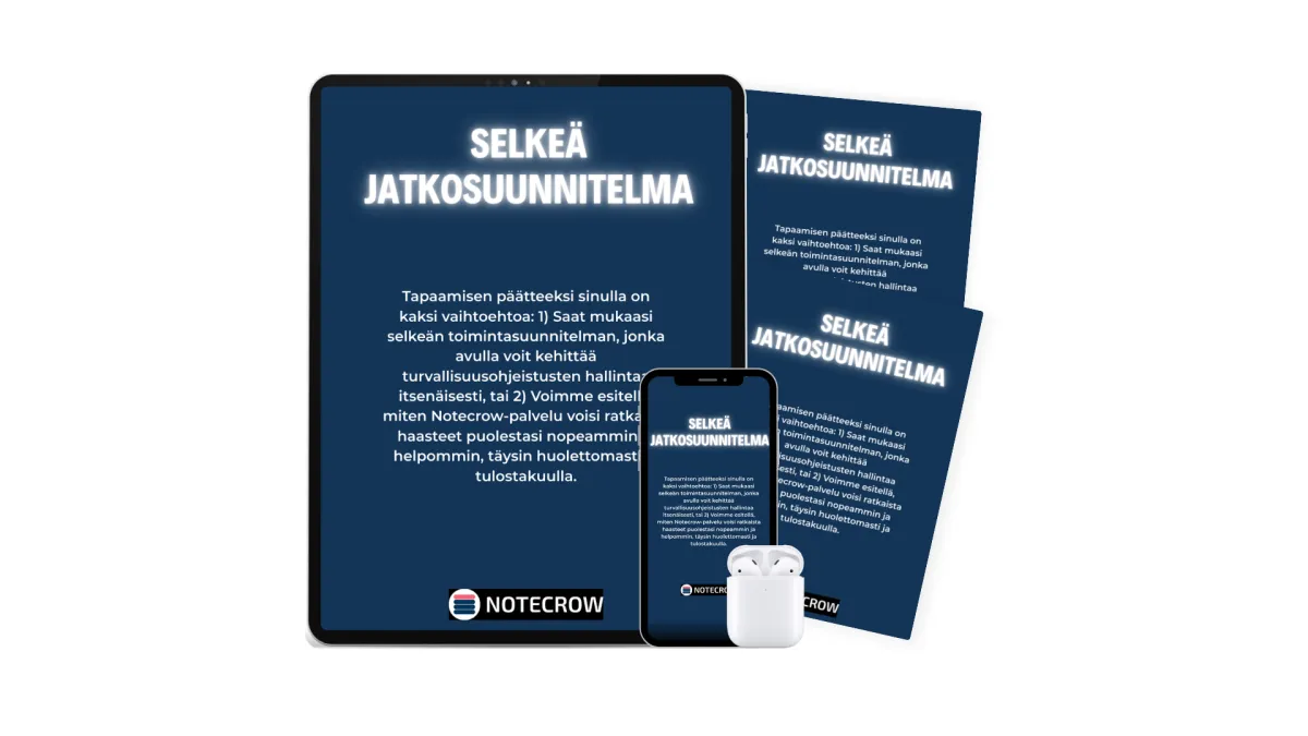 Tapaamisen päätteeksi sinulla on kaksi vaihtoehtoa: 1) Saat mukaasi selkeän toimintasuunnitelman, jonka avulla voit kehittää turvallisuusohjeistusten hallintaa itsenäisesti, tai 2) Voimme esitellä, miten Notecrow-turvakansio voisi ratkaista haasteet puolestasi nopeammin ja helpommin, täysin huolettomasti ja tulostakuulla.